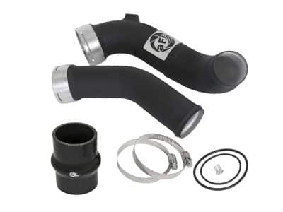 Perfect Fit: Includes stainless steel clamps for a leak-free seal and heavy-duty 5-Ply polyester reinforced silicone hump coupling for strength. Mandrel-bent Tubing: Constructed of 2-1/2″ to 3″ mandrel-bent aluminum tubing then powder-coated wrinkle-black for heat and corrosion resistance. The smooth transition mandre l bends decrease turbulence which increases horsepower and torque. The high-temp wrinkle-black powder-coating insulates the tubes from engine heat and protects them from corrosion. Two 1/8″ NPT ports are provided for sensors or water-methanol injection. aFe Badging: Unique aluminum laser-cut aFe Power logo plate is welded-on for an aggressive style.