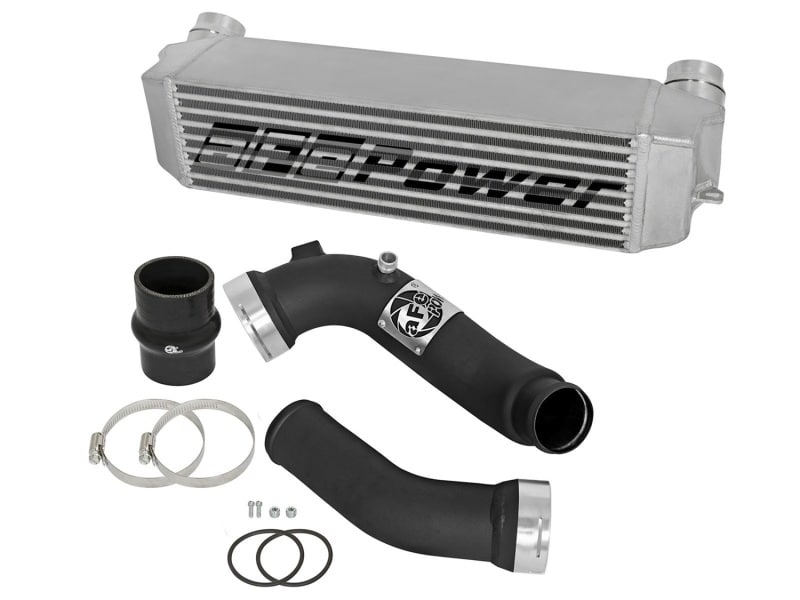 End Tanks: The unique BladeRunner end tanks are constructed out of 3/16″ thick aluminum plates and include two 1/8″ NPT ports for sensors or water-methanol injection. 5″ Bar and Plate Core Design: The use of the bar and plate core design allows for greater airflow and increased heat dissipation over the much smaller tube and fin design used by the factory. TIG-Welded: 100% TIG-Welded inside and out by a certified craftsmen for strength and durability. TIG-Welding provides the strongest welds while reducing stress cracks. Pressure Tested: The BladeRunner Intercooler is test pressur e rated at 200psi. Mandrel-bent Tubing: Constructed of 2-1/2″ to 3″ mandrel-bent aluminum tubing and powder-coated wrinkle-black for heat and corrosion resistance. The smooth transition mandrel bends decrease turbulence which increases horsepower and torque. The high-temp wrinkle-black powder-coating insulates the tubes from engine heat and protects them from corrosion. aFe Badging: Unique aluminum laser-cut aFe Power logo plate is welded-on for an aggressive style. Perfect Fit: Includes stainless steel clamps for a leak-free seal and heavy-duty 5-Ply reinforced silicone coupling for strength.