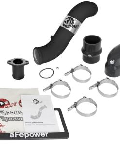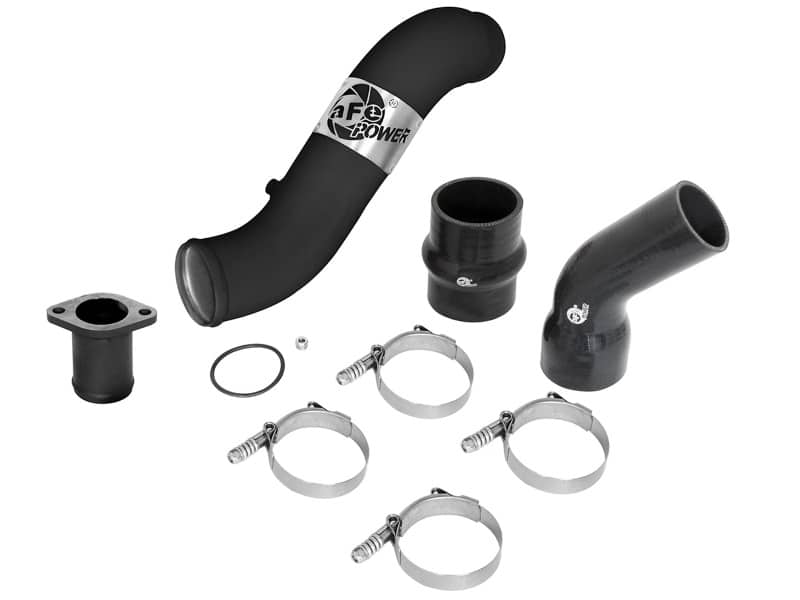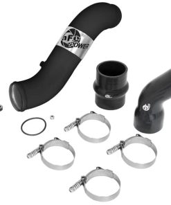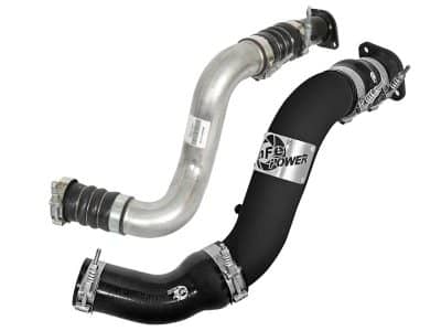 Flow and Performance: Constructed of 3″ mandrel bent, powder-coated aluminum tubing for maximum flow. The smooth transition bends decrease turbulence and minimize pressure loss, increasing horsepower, torque and lowering EGT’s. Installs on the Hot Side to transfer heated air smoothly to the intercooler to accelerate heat transfer for better performance. Perfect Fit: Utilizes the factory mounting locations to provide stability for a hassle-free installation. Includes high quality stainless steel spring loaded t-bolt clamps and heavy-duty 5-Ply couplings for strength. Fits OEM or aFe’s upgraded intercooler (46-20281). aFe Badging: A unique stainless steel laser-cut aFe power logo plate is welded-on for an aggressive style