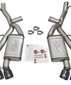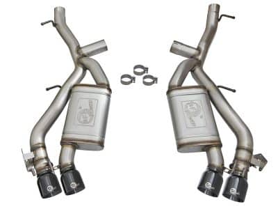 Testing: In testing, the axle-back exhaust system produced a max gain of +4 horsepower and +4 ft. lbs. of torque verified by our in house dyno. Potential for up to +24 horsepower and +27 lbs. x ft. of torque when combined with aFe’s Twisted Steel street Tri-Y headers/X-Pipe (P/N: 48-34127-YC). Aggressive Sound: Dual free-flowing mufflers are used to absorb high pitch tones producing a powerful sound and unleashing all available horsepower and torque. Exhaust Valve: This axle-back exhaust system incorporates factory style NPP dual mode exhaust valves which use the factory exhaust valve motors (not included). The valves help regulate, direct and control the flow of exhaust gases by opening, closing, or partially obstructing passageways depending on throttle position for maximum performance. 304 SS Construction: The performance axle-back exhaust system is constructed of 3″ mandrel-bent, 304 stainless steel tubing for maximum performance, corrosion resistance and strength eliminating cracking. Simple Installation: This MACH Force-Xp axle-back exhaust system uses factory mounting locations providing stability and a hassle-free installation. Quad Gloss Black Tips: Finishing off this system are quad gloss black, 4″ diameter tips. The tips come with a laser-etched aFe power logo for an aggressive style. Leak-Free Seal: High quality band clamps are used for a complete 360 degree sealing surface. Note: This system only fits manual transmissions models without AFM valves.