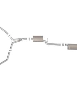 This cat-back exhaust system is constructed of 3 IN to 2-1/2 IN mandrel-bent 304 stainless steel tubing for maximum strength and durability. This system features high-flow stainless steel mufflers, producing a mild sound. Finishing off this exhaust system are dual 4 IN diameter carbon fiber 304 stainless steel clamp-on exhaust tips. The tips features an aFe POWER logo for a unique style. This system produces a mild sound unleashing all available horsepower and torque. Utilizing a factory style flange and hangers this system is a direct bolt-on system, which requires no cutting or modifications for a hassle-free installation. This cat-back exhaust system uses a heavy duty flex pipe with an internal interlock liner for added strength and durability. Utilizing state-of-the-art computer-aided design technology, this exhaust system is designed for custom, high tolerance factory fitment. 100% MIG-Welded for race-proven strength and durability.