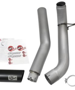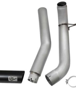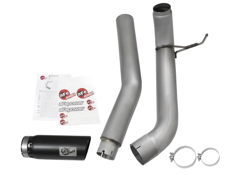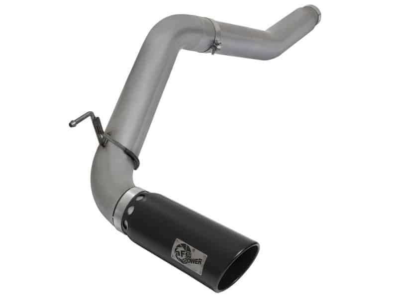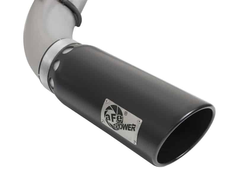 aFe LARGE BORE HD exhaust systems are constructed from mandrel-bent stainless steel tubing for maximum flow. Smooth transition bends allow for low turbulence, increasing horsepower and torque, while decreasing EGT. The 2-piece design and bayonet style hangers provide stability and for an easy installation. Finishing off the exhaust is a black, stainless steel slash cut tip with intercooling vents designed to reduce exhaust gas temperatures at the tailpipe. A unique stainless steel laser-cut aFe Power logo plate is riveted on for an aggressive style.