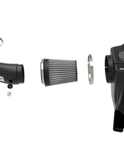 The smooth one-piece sealed housing is used to eliminate the use of multiple-piece housings and ensure the coolest air intake charge available. This System uses a CAD designed, dyno-tuned, roto-mold intake tube to achieve maximum power gains while maintaining a perfect fit. The Momentum ST intake is designed around an oil-free, large 9″ Tall conical flat top 360 degree radial flow performance air filter with 3-layers of progressive finer porosity synthetic media providing maximum convenience. The unique air filter-to-housing interface (patent pending) allows for maximum filter size which increases the available air volume while simplifying the installation process. Premium stainless steel worm gear clamps and a silicone coupler are used for strength and durability while also providing the most secure installation available. Momentum ST intakes are designed with fewer parts for a quick and simple installation.