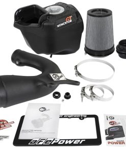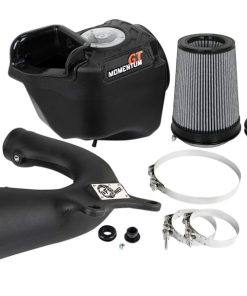 A custom CAD designed roto-molded housing made from heat soak resistant material eliminates the use of multiple components and ensures the coolest air intake charge available. A large clear sight window allows for filter inspection without removal of the airbox. The roto-molded housing is made out of black cross-linked polyethylene. (US PAT 9440175) For Filter-to-Housing Interface. This system uses a high quality plastic CAD designed, dyno-tuned, roto-molded intake tube to achieve maximum power gains while maintaining a perfect fit. This Momentum GT intake system was designed around the largest filter possible to allow maximum performance and filtration. This cone filter has a large 5″ flange and is 9″ tall with an inverted top. The Pro DRY S performance air filter features 3-layers of progressive finer porosity synthetic media providing maximum convenience with 100% polyurethane frame for long life and multiple cleaning cycles. Premium stainless steel clamps and a silicone coupling are used for strength and durability while also providing the most secure installation available. Momentum GT intakes are designed with fewer parts for a quick and simple installation.