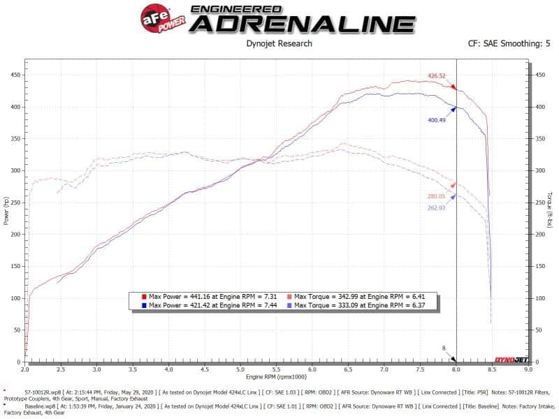 Increase airflow and add more power to your Audi R8 with this Track Series Cold Air Intake system which produced gains of up to +26 horsepower and +17 lbs. x ft. torque as measured on our in-house Dynojet dyno. This system includes massive, dual 6” tall 360-degree radial flow air filters that feature integrated factory mass airflow sensor mounts designed for maximum performance. 100% twill weave carbon fiber bases and tops are strong and lightweight, which complements the look of your R8. Our pre-oiled Pro 5R media with five layers of progressively finer oiled cotton gauze media is our highest flowing filter media, perfect for street and/or track use. Replaces restrictive factory bellows couplers with smooth flowing reinforced silicone couplers. This reduces air turbulence and provides a more aerodynamic flow path to the throttle bodies for more power. This computer designed intake system utilizes the factory airbox and cover and provides all the necessary hardware for a hassle-free installation process that requires no modifications.