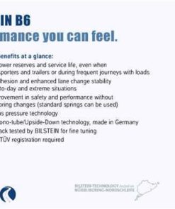 Bilstein B6 Performance dampers are a performance upgrade to OE dampers designed to be paired with the OE factory spring. These dampers offer application specific valve settings with a monotube design to bring out the best handling performance of a vehicle. Each damper is rigorously tested for quality that meets or exceeds OE standards. B6 Performance dampers will provide improved safety and handling performance with the added benefit of world-famous Bilstein quality.