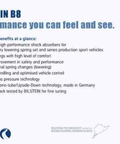 Bilstein B8 Performance Plus dampers are a performance upgrade to OE dampers designed to be paired with aftermarket lowering springs. These dampers offer application specific valve settings with a monotube design to bring out the best handling performance of a vehicle. Each damper is rigorously tested for quality that meets or exceeds OE standards. B8 Performance Plus dampers are the ideal solution for pairing with a lowering spring for improved handling and sportier look with the added benefit of world-famous Bilstein quality.