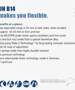 Bilstein B14 (PSS) suspension kits feature ride height adjustability in an OE quality, direct fit package. These kits offer monotube performance dampers with matched springs that are tuned for each specific application. The zinc coated and threaded body design will give you the flexibility to find the perfect ride height setting for your intended use while providing unsurpassed protection against the harshest road elements. B14 (PSS) suspension kits are made in Germany and feature technology tested on the famed Nurburgring.