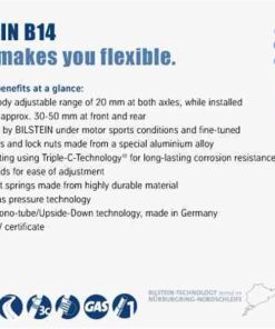 The Bilstein B14 (PSS) suspension kit features both coilover and standard monotube gas shocks with performance-level valving, with application specific, progressive rate coil springs. The solid aluminum spring seat and lock nut allows for precise adjustment of the vehicle’s lowered ride height from 30mm to 50mm, even while installed. Bilstein’s patented Triple-C-Technology coating ensures long-lasting resistance to corrosion. The B14 (PSS) suspension kit is ideal for the driver looking to set a car’s ride height for both looks and improved handling.