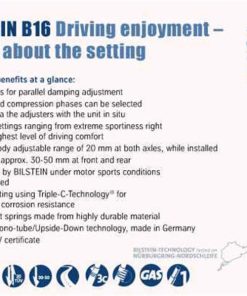 The Bilstein B16 PSS10 kit is the ultimate race inspired suspension system, delivering unsurpassed driving performance in any situation. This kit puts you in complete control, providing the kind of precise suspension tuning formerly available only on race cars. From a weekend of competition to daily driving, this system provides perfect handling performance for every situation. The manually adjustable damping mono-tube gas shock absorbers feature 10-stage precise compression and rebound settings, from comfort to competition. Bilstein utilizes debris resistant round threads on these dampers to ensure spring adjustment remains effortless throughout the life of the kit. The surface is coated with Triple-C-Technology coating to ensure long lasting resistance to corrosion and flashy good looks.