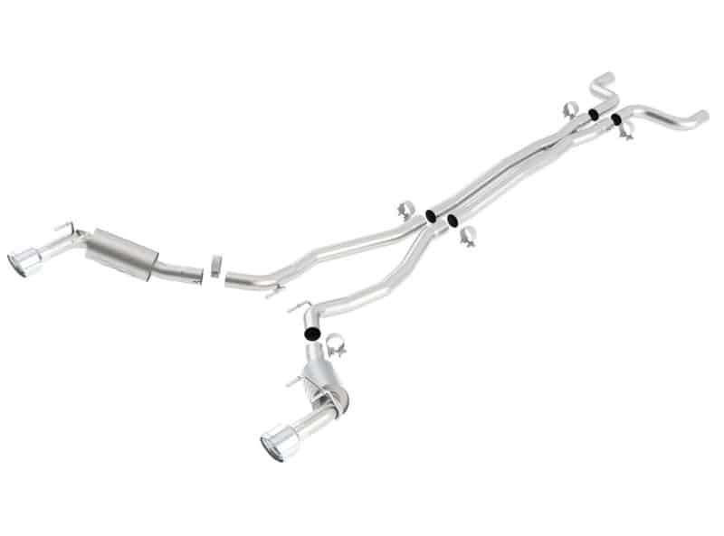 This is BORLA?’S complete Cat-Back? system including a merge X-Pipe and ATAK? mufflers for improved performance and great sound on the Camaro SS WITHOUT the factory Ground Effects package. System features polished T-304 stainless steel tips for a sharp appearance. BORLA? has developed a revolutionary exhaust technology that enables our engineers to deliver unprecedented vehicle-specific control over the acoustical note of an exhaust throughout the RPM range, while retaining 100% of the power-adding capabilities of BORLA??s patented multicore design. Called ATAK? (Acoustically-Tuned Applied Kinetics), this technology produces the highest available dB (decibel) levels in the BORLA? street-legal lineup, and is designed for high-performance purists who prefer exhaust notes over their stereos. The focus of ATAK? is to pump the volume while retaining clarity of sound, avoiding distortion typically found in louder exhausts. With ATAK?, the sound output is tuned like a graphic equalizer to shape and focus sound waves for optimum high-volume output. The development of each ATAK? system begins with extensive study of each vehicle?s acoustical properties. The technology is based on custom-tuned attributes of the internal muffler cores, which are calibrated on a vehicle-by-vehicle basis to deliver the most desirable sound. A complete technology overview can be viewed at www.youtube.com/borla. Several BORLA? ATAK? systems are currently available. For the 2010-2013 6.2L V8 Camaro there is a Cat-Back? system and an Axle-Back system for models without the ?Ground Effects? option, and a Cat-Back? system and an Axle-Back system designed to complement the Ground Effects kit. Like all BORLA? exhaust products, each system is handmade in the USA by master craftspeople and features premium, high-quality T-304 austenitic stainless steel construction, ultra-smooth mandrel bent piping, mirror-polished tips, and a Million-Mile Warranty.