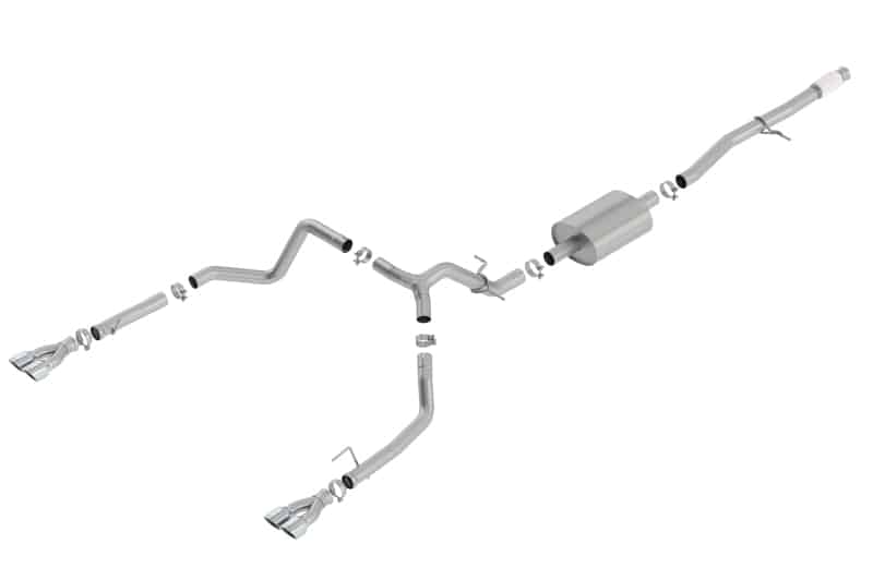 Factory Split Rear Exit ONLY. This system features bright chrome on T-304 stainless steel tips. Add adapter 60708 for crew cab standard bed (6′ 7″) 157″ wheelbase vehicles. BORLA? Cat-Back? & Axle-Back exhaust systems feature patented straight-through and multi-core technology designed to unleash hidden horsepower. Increased exhaust velocity adds power, driving excitement, fuel economy, and the distinctive BORLA? Sound of Power respected by motoring enthusiasts everywhere. Each system is built from premium T-304 stainless steel, superior to T-400 series knockoffs (such as 409), to give you the absolute best in performance and durability. Ultra-smooth mandrel bends ensure maximum flow & power, and precision computer numerical control (CNC) manufacturing ensures an accurate fit. Best of all, BORLA? stands behind every system with a Million-Mile Warranty. Just what you?d expect from the world?s most experienced (and most winning) exhaust brand.