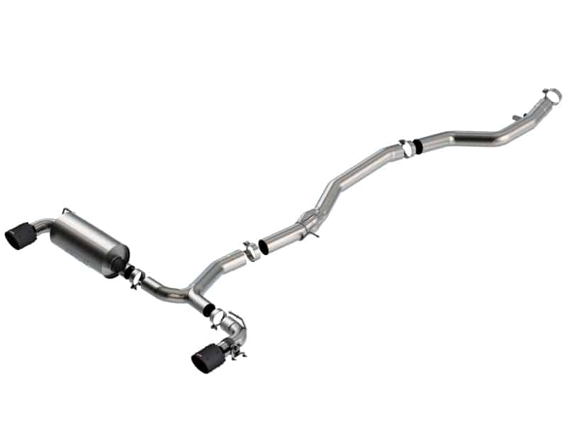 The Borla(R) ATAK(R) system 140826CFBA, is specifically tuned for performance and sound on the GR Supra?s 3.0L twin-scroll turbocharged inline six engine. Our system is designed to be drone-free so you can get the head-turning sound of the ATAK(R) and still enjoy a comfortable cabin during cruise. This Cat-Back(TM) features a 3.5″ pipe diameter that splits into dual 3″ and comes with 4.5″ Carbon Fiber tips with black anodized centers to complete the look of the exhaust. It includes our Polyphonic Harmonizer technology which utilizes patented units that contain pipes of different diameters and lengths to create multiple exhaust notes that harmonize to deliver a clean, rich, full-bodied sound to the BORLA? mufflers. The mufflers then enhance this sound to the character and volume appropriate for this ATAK(R) system. The system also has a functioning valve that works with the factory actuator to change the exhaust volume. As with all Borla(R) products, it is constructed using T-304 stainless steel for increased durability and is backed by our Million Mile Warranty. Bolt-on a Borla(R) and give your Supra the sound it deserves.