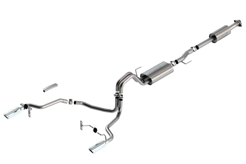 The Borla(r) Cat-Back(tm) system 140865 was specifically designed to enhance the power and sound of the Ford F-150 equipped with the 5.0L V8 engine. It includes bright chromed T-304 stainless steel tips and a split rear exit configuration. The entire system is made of T-304 stainless steel and utilizes computer numerical control (CNC) manufacturing techniques that ensure an accurate fit. This system features the “Touring” sound that gives you a mild sound of power with no drone. It is also available with black chromed tips (part number 14086BC). There are additional systems available for the 5.0L F-150 that offer different options for sound level, tip finish and tip exits. All this is backed by our unsurpassed Million Mile Warranty., System Features:, Cat-Back(tm) System, Split Rear Exit, Bright Chrome On T-304 Stainless Steel Tips, Touring Sound Level, T-304 Stainless Steel Construction, Bolt-On Installation, Million Mile Warranty