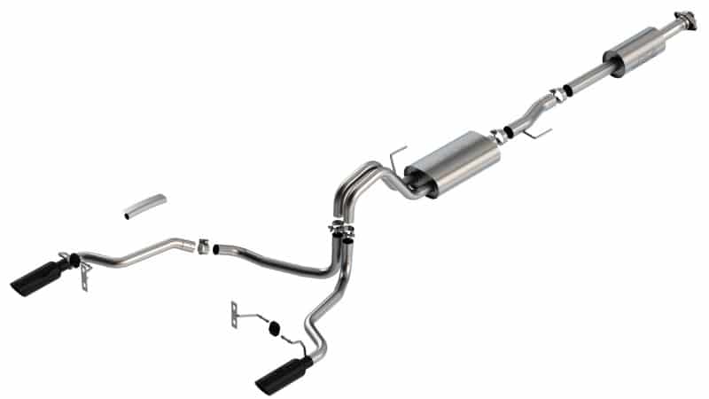 The Borla(r) Cat-Back(tm) system 140865BC was specifically designed to enhance the power and sound of the Ford F-150 equipped with the 5.0L V8 engine. It includes black chromed T-304 stainless steel tips and a split rear exit configuration. The entire system is made of T-304 stainless steel and utilizes computer numerical control (CNC) manufacturing techniques that ensure an accurate fit. This system features the “Touring” sound that gives you a mild sound of power with no drone. It is also available with bright chromed tips (part number 140865). There are additional systems available for the 5.0L F-150 that offer different options for sound level, tip finish and tip exits. All this is backed by our unsurpassed Million Mile Warranty., System Features:, Cat-Back(tm) System, Split Rear Exit, Black Chrome On T-304 Stainless Steel Tips, Touring Sound Level, T-304 Stainless Steel Construction, Bolt-On Installation, Million Mile Warranty