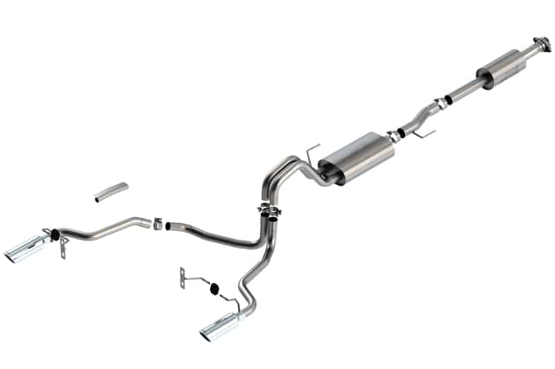 The Borla(r) Cat-Back(tm) system 140878 was specifically designed to enhance the power and sound of the Ford F-150 equipped with 3.3L engine. It includes bright chromed T-304 stainless steel tips and a split rear exit configuration. The entire system is made of T-304 stainless steel and utilizes computer numerical control (CNC) manufacturing techniques that ensure an accurate fit. This system features the “S-Type” sound level that gives you an aggressive sound level with no drone. It is also available with black chromed tips (part number 140878BC). There are also systems available for the 3.3L F-150 that offer different options for sound level, tip finish and tip exits. All this is backed by our unsurpassed Million Mile Warranty., System Features:, Cat-Back(tm) System, Split Rear Exit, Bright Chrome On T-304 Stainless Steel Tips, S-Type Sound Level, T-304 Stainless Steel Construction, Bolt-On Installation, Million Mile Warranty