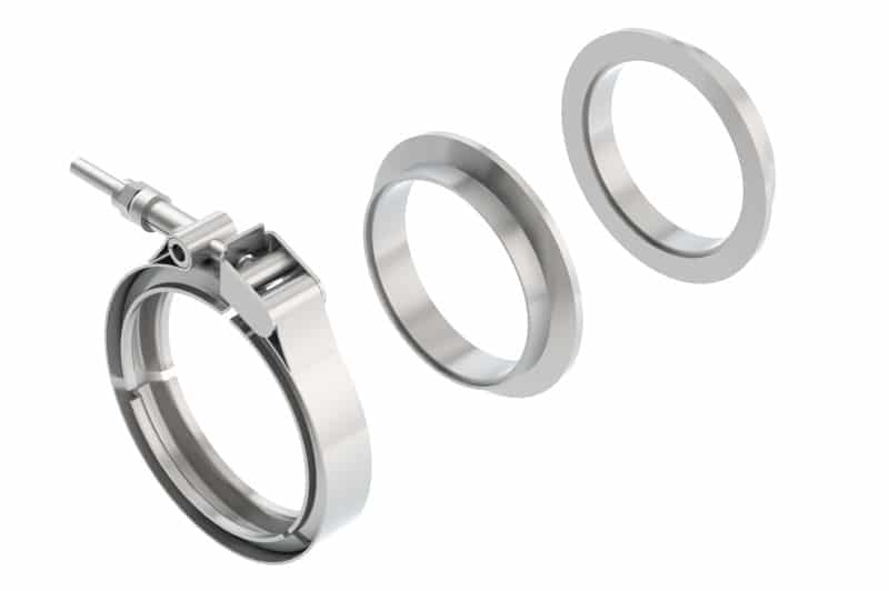Made from T-304 Stainless steel. V-Band clamps work well in stressful, vibration, and extreme temperature conditions. Allow for a gasket free seal, and quick disassembly. Feature a male / female design to ensure proper alignment of flanges inside of clamp. Natural Mill finish. Can be brushed or polished prior to installation. Contains 1 male flange, 1 female flange, 1 clamp.