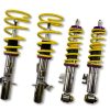 The KW Variant 1 INOX-LINE coilover kit is our entry point into our street performance lineup. The high-quality INOX-LINE stainless steel coilover struts, corrosion resistant springs, bumps stops and dampers that are optimally tuned by our engineers. The result is a balanced and sporty feel specific to each vehicle application designed for long lasting driving pleasure. With KW Variant 1 coilovers you can achieve maximum lowering within an approved lowering range that ensures a proper functioning suspension and adequate travel after your car is lowered. Even after years of use you can easily adjust the ride height thanks to the dirt resistant trapezoid thread and composite Adjustment -ollar. KW Variant 1 INOX-LINE coilover rewards the sporty driver with its pre-configured setup. For each vehicle, our engineers develop a specific damper setup and spring rate to increase the driving pleasure with an optimal balance of sportiness and practicality. As with all KW coilovers, the engineers at KW fine tune each application on the Nurburgring Nordschleife and at the KW 7-post chassis dynamics test center. Unlike a mass produced, generic coilover kit, KW coilovers are developed specifically for your vehicle. As a manufacturer, KW uses only its own resources, high quality components and the damper technology -hat was all developed in-house. With the KW Variant 1 coilovers, body roll will be reduced during compression giving you the benefit of a more genuine and direct sporty handling while driving. For over 20 years, KW automotive has been the market leader and driving innovation as a manufacturer of individual suspension solutions for the road and in all types of motorsports. No matter where in the world, gearheads, automobile manufacturers and reputable tuners rely on our KW coilovers made in Germany. With an application list comprising more than 4,600 options KW guarantees an outstanding selection backed by our Limited Lifetime Warranty.