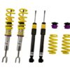 The KW Variant 1 INOX-LINE coilover kit is our entry point into our street performance lineup. The high-quality INOX-LINE stainless steel coilover struts, corrosion resistant springs, bumps stops and dampers that are optimally tuned by our engineers. The result is a balanced and sporty feel specific to each vehicle application designed for long lasting driving pleasure. With KW Variant 1 coilovers you can achieve maximum lowering within an approved lowering range that ensures a proper functioning suspension and adequate travel after your car is lowered. Even after years of use you can easily adjust the ride height thanks to the dirt resistant trapezoid thread and composite Adjustment -ollar. KW Variant 1 INOX-LINE coilover rewards the sporty driver with its pre-configured setup. For each vehicle, our engineers develop a specific damper setup and spring rate to increase the driving pleasure with an optimal balance of sportiness and practicality. As with all KW coilovers, the engineers at KW fine tune each application on the Nurburgring Nordschleife and at the KW 7-post chassis dynamics test center. Unlike a mass produced, generic coilover kit, KW coilovers are developed specifically for your vehicle. As a manufacturer, KW uses only its own resources, high quality components and the damper technology -hat was all developed in-house. With the KW Variant 1 coilovers, body roll will be reduced during compression giving you the benefit of a more genuine and direct sporty handling while driving. For over 20 years, KW automotive has been the market leader and driving innovation as a manufacturer of individual suspension solutions for the road and in all types of motorsports. No matter where in the world, gearheads, automobile manufacturers and reputable tuners rely on our KW coilovers made in Germany. With an application list comprising more than 4,600 options KW guarantees an outstanding selection backed by our Limited Lifetime Warranty.