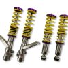 KW Variant 2 INOX-LINE coilovers are the perfect solution for drivers who want more than just outstanding looks and adjustable ride height. In addition to stainless steel coilover struts, and corrosion-resistant components built for long term durability, KW Variant 2 coilovers utilize TVR-A (Twin Valve Rebound – Adjustable) technology -o allow Adjustment -f the rebound damping characteristics with 16 clicks so you can fine tune the ride comfort or performance to your satisfaction. As with all KW coilovers our engineers develop vehicle specific damper settings that undergo comprehensive testing on the Nurburgring Nordschleife and in our KW 7-post Driving Dynamic Test Center. With a KW coilover kit the driving experience is more dynamic and direct. With the rebound adjustability you have more direct influence on the handling or comfort of the car. With 16 precise clicks you can adjust the KW dampers (more firm or more comfortable) without affecting the compression damping fine-tuned by our engineers. The two-stage, patented TVR-A (Twin Valve Rebound – Adjustable) technology -nables a small volume of oil flow through an adjustable, conically shaped, low-speed bypass during low damper speeds, while at high damper speeds, the main rebound stage valve opens allowing a larger volume of oil to flow. This provides a big improvement in terms of ride comfort without influencing the high-speed range. There are 16 precise clicks available for individual settings, so you can choose between more comfort or more body control. For over 20 years, KW automotive has been the market leader and driving innovation as a manufacturer of individual suspension solutions for the road and in all types of motorsports. No matter where in the world, gearheads, automobile manufacturers and reputable tuners rely on our KW coilovers made in Germany. With an application list comprising more than 4,600 options KW guarantees an outstanding selection backed by our Limited Lifetime Warranty.