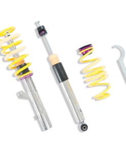 Cutting-edge motorsports technology -or more performance on the road. Like every suspension product developed by KW automotive and manufactured in Germany, the KW Variant 3 Coilover suspension kit also provides a significant improvment on the road. Thanks to the high-quality dampers, springs, and elastomer spring elements, pitching and rolling movements during load changes such as evasive maneuvers, cornering, acceleration, and braking are significantly reduced. The braking distances are also shortened. Thanks to improved support and feedback, drivers not only feel more confident but driving in everyday life is improved. With compression and rebound stage damping, that can be set separately and independently of each other, the damper setup can be customized to your personal driving preferences or vehicle changes such as weight, tire characteristics, or altered vehicle rigidity. True performance optimization is only possible with this unique, patented system. For example, this allows the compression damping force to be increased and get more grip from the tires, to improve cornering behavior and reduce squat without simultaneously altering the rebound stage damping which is optimally matched to the spring rate ? a scenario which results in reduced grip and the associated loss of performance. The KW Variant 3 INOX-LINE coilover kit is the ideal tool for performance-oriented drivers and experienced tuning enthusiasts who place a strong emphasis on the overall performance of their suspension. The Variant 3 features patented TVR-A and TVC-A technology -hat provides separately adjustable rebound and compression damping. The extensive Adjustment -ange of the independently configurable rebound and compression make it easy to directly influence the steering behavior, directional stability, grip and handling characteristics for confident and repeatable results at the limit of driving dynamics.