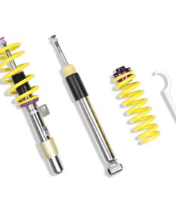 Cutting-edge motorsports technology -or more performance on the road. Like every suspension product developed by KW automotive and manufactured in Germany, the KW Variant 3 Coilover suspension kit also provides a significant improvment on the road. Thanks to the high-quality dampers, springs, and elastomer spring elements, pitching and rolling movements during load changes such as evasive maneuvers, cornering, acceleration, and braking are significantly reduced. The braking distances are also shortened. Thanks to improved support and feedback, drivers not only feel more confident but driving in everyday life is improved. With compression and rebound stage damping, that can be set separately and independently of each other, the damper setup can be customized to your personal driving preferences or vehicle changes such as weight, tire characteristics, or altered vehicle rigidity. True performance optimization is only possible with this unique, patented system. For example, this allows the compression damping force to be increased and get more grip from the tires, to improve cornering behavior and reduce squat without simultaneously altering the rebound stage damping which is optimally matched to the spring rate ? a scenario which results in reduced grip and the associated loss of performance. The KW Variant 3 INOX-LINE coilover kit is the ideal tool for performance-oriented drivers and experienced tuning enthusiasts who place a strong emphasis on the overall performance of their suspension. The Variant 3 features patented TVR-A and TVC-A technology -hat provides separately adjustable rebound and compression damping. The extensive Adjustment -ange of the independently configurable rebound and compression make it easy to directly influence the steering behavior, directional stability, grip and handling characteristics for confident and repeatable results at the limit of driving dynamics.