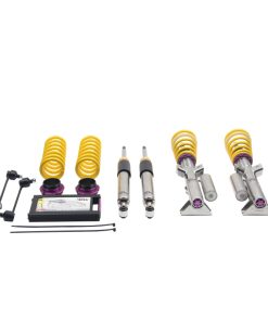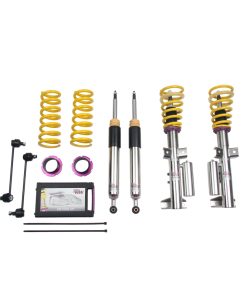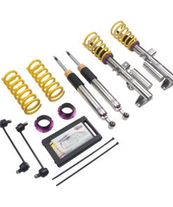 Cutting-edge motorsports technology -or more performance on the road. Like every suspension product developed by KW automotive and manufactured in Germany, the KW Variant 3 Coilover suspension kit also provides a significant improvment on the road. Thanks to the high-quality dampers, springs, and elastomer spring elements, pitching and rolling movements during load changes such as evasive maneuvers, cornering, acceleration, and braking are significantly reduced. The braking distances are also shortened. Thanks to improved support and feedback, drivers not only feel more confident but driving in everyday life is improved. With compression and rebound stage damping, that can be set separately and independently of each other, the damper setup can be customized to your personal driving preferences or vehicle changes such as weight, tire characteristics, or altered vehicle rigidity. True performance optimization is only possible with this unique, patented system. For example, this allows the compression damping force to be increased and get more grip from the tires, to improve cornering behavior and reduce squat without simultaneously altering the rebound stage damping which is optimally matched to the spring rate ? a scenario which results in reduced grip and the associated loss of performance. The KW Variant 3 INOX-LINE coilover kit is the ideal tool for performance-oriented drivers and experienced tuning enthusiasts who place a strong emphasis on the overall performance of their suspension. The Variant 3 features patented TVR-A and TVC-A technology -hat provides separately adjustable rebound and compression damping. The extensive Adjustment -ange of the independently configurable rebound and compression make it easy to directly influence the steering behavior, directional stability, grip and handling characteristics for confident and repeatable results at the limit of driving dynamics.
