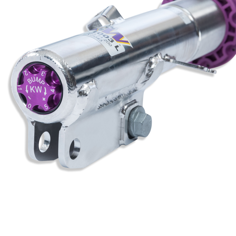 Cutting-edge motorsports technology -or more performance on the road. Like every suspension product developed by KW automotive and manufactured in Germany, the KW Variant 3 Coilover suspension kit also provides a significant improvment on the road. Thanks to the high-quality dampers, springs, and elastomer spring elements, pitching and rolling movements during load changes such as evasive maneuvers, cornering, acceleration, and braking are significantly reduced. The braking distances are also shortened. Thanks to improved support and feedback, drivers not only feel more confident but driving in everyday life is improved. With compression and rebound stage damping, that can be set separately and independently of each other, the damper setup can be customized to your personal driving preferences or vehicle changes such as weight, tire characteristics, or altered vehicle rigidity. True performance optimization is only possible with this unique, patented system. For example, this allows the compression damping force to be increased and get more grip from the tires, to improve cornering behavior and reduce squat without simultaneously altering the rebound stage damping which is optimally matched to the spring rate ? a scenario which results in reduced grip and the associated loss of performance. The KW Variant 3 INOX-LINE coilover kit is the ideal tool for performance-oriented drivers and experienced tuning enthusiasts who place a strong emphasis on the overall performance of their suspension. The Variant 3 features patented TVR-A and TVC-A technology -hat provides separately adjustable rebound and compression damping. The extensive Adjustment -ange of the independently configurable rebound and compression make it easy to directly influence the steering behavior, directional stability, grip and handling characteristics for confident and repeatable results at the limit of driving dynamics.