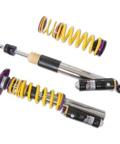 Using the Nordschleife as it’s testing grounds and the 7-post rig, KW developed it’s 3-way Clubsport coilover kit. Wheel loads, vehicle weight and chassis reinforcements (increased body stiffness) can all be taken into consideration with Adjustment -apabilities of the 3-way Clubsport. The KW Clubsport coilovers combine KW’s high-end racing technology -ith maintenance-free KW OEM quality components. Designed to provide you the ideal product to utilize the full potential of your sports car during autocross, track days, high performance drivers education (HPDE) courses, club racing, and is tested rigorously on race tracks such as the Nurburgring Nordschleife. Race teams rely on KW’s racing expertise and experience for their vehicle setup. This same championship winning pedigree is mirrored in the development of each one of the KW Clubsport coilover systems. Similar to the KW Competition suspension used in international motorsports, the KW 3-Way Clubsport coilover kit allows fine tuning of the compression damping separately in the low-speed and high-speed range. The click adjustments of the TVCLH-A valve technology -ake for easy Adjustment -irectly on the reservoir. You can modify the low-speed compression damping with 6 precise clicks with the purple low speed Adjustment -ial and directly beneath it the golden Adjustment -heel provides an additional 14 precise clicks of high speed compression adjustment. In addition, the TVR-A technology -rovides 16 clicks to noticeably adjust the rebound damping independently of the compression damping. If you would like to adjust the KW 3-Way Clubsport coilover kit it can easily be adjusted for more comfort or to an alternative setup for a new race track. The KW 3-Way Clubsport benefits from the same motorsports technology -hat has proven its endurance with multiple overall wins at the ADAC Zurich 24h Nurburgring race.