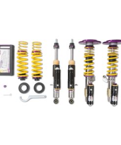Using the Nordschleife as it’s testing grounds and the 7-post rig, KW developed it’s 3-way Clubsport coilover kit. Wheel loads, vehicle weight and chassis reinforcements (increased body stiffness) can all be taken into consideration with Adjustment -apabilities of the 3-way Clubsport. The KW Clubsport coilovers combine KW’s high-end racing technology -ith maintenance-free KW OEM quality components. Designed to provide you the ideal product to utilize the full potential of your sports car during autocross, track days, high performance drivers education (HPDE) courses, club racing, and is tested rigorously on race tracks such as the Nurburgring Nordschleife. Race teams rely on KW’s racing expertise and experience for their vehicle setup. This same championship winning pedigree is mirrored in the development of each one of the KW Clubsport coilover systems. Similar to the KW Competition suspension used in international motorsports, the KW 3-Way Clubsport coilover kit allows fine tuning of the compression damping separately in the low-speed and high-speed range. The click adjustments of the TVCLH-A valve technology -ake for easy Adjustment -irectly on the reservoir. You can modify the low-speed compression damping with 6 precise clicks with the purple low speed Adjustment -ial and directly beneath it the golden Adjustment -heel provides an additional 14 precise clicks of high speed compression adjustment. In addition, the TVR-A technology -rovides 16 clicks to noticeably adjust the rebound damping independently of the compression damping. If you would like to adjust the KW 3-Way Clubsport coilover kit it can easily be adjusted for more comfort or to an alternative setup for a new race track. The KW 3-Way Clubsport benefits from the same motorsports technology -hat has proven its endurance with multiple overall wins at the ADAC Zurich 24h Nurburgring race.