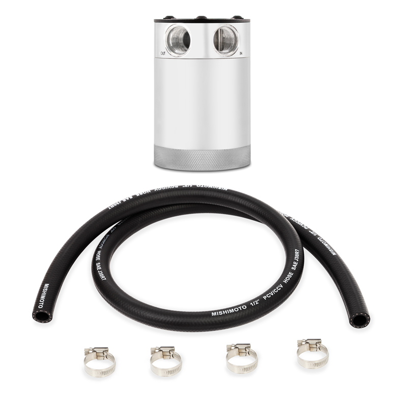 Mishimoto is proud to announce the release of our Compact Baffled Oil Catch Can, available in a two-port or three-port option. With years of oil catch can research and development time, Mishimoto has created the most effective compact oil catch can on the market. The Mishimoto Compact Baffled Oil Catch Can was designed to separate oil particles from the PCV/CCV air that would normally have just been routed back to your intake. The internal air diverter turbulates the air longer and ensures all the oil sinks to the bottom of the can, leaving nothing but clean air to pass through the 50 micron bronze filter to the intake. An internal baffle keeps the collected oil from splashing around under race conditions. This oil catch can features two ports, one inlet and one outlet, for easy installation on CCV and PCV systems. The 100% billet, 6061 aluminum can features 3/8″ NPT threads at the inlet, outlet, and drain area and includes two black nylon fittings to make installation effortless. For maximum fitment options, the top mounting setup allows the can to be mounted from multiple angles. To make maintenance easy, the drain plug can be removed to allow for a return to the oil pan. The can is also 100% washable, unlike many other cans that require you to replace your filtration system.Our catch cans are different from most air-oil-separator (AOS) systems on a few levels. First, our catch cans are not heated. This means that all of the blow-by is able to condense in the can, including low-octane oil vapors and contaminated fuel vapors. Most AOS systems also drain the blow-by back into the oil pan, while our catch cans trap the blow-by and keep it out of the engine permanently. If you’ve seen what we’ve seen in the bottom of our catch cans, you won’t want that draining back into your oil either.