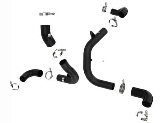 Smooth transitions in the mandrel-bent aluminum tubing decrease turbulence and minimize pressure loss, increasing horsepower and torque. The BladeRunner I/C tube kit provides a smooth transition between the turbo and the engine for lower operating temperatures and increased power. This tube kit includes high-quality, stainless-steel, spring-loaded T-bolt clamps and heavy-duty, 5-ply, polyester reinforced silicone couplings for superior strength and durability. Finished in Wrinkle Black powder coating with a unique laser-etched aFe Power logo for a custom look.