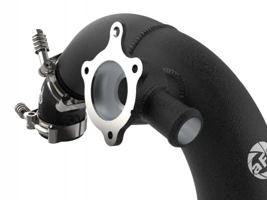 Smooth transitions in the mandrel-bent aluminum pipe decrease turbulence and minimize pressure loss, increasing horsepower and torque. This kit includes high-quality, stainless-steel, spring-loaded T-bolt clamps and heavy-duty, 5-ply, polyester reinforced silicone couplings. This charge pipe kit features factory style billet aluminum quick-connect adapter with an O-ring to ensure a leak-free fit while maintaining superior strength and durability. Finished in wrinkle black powder coating with a unique laser-etched aFe power logo for a custom look.