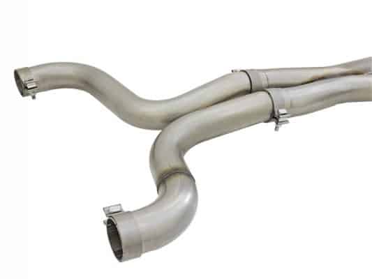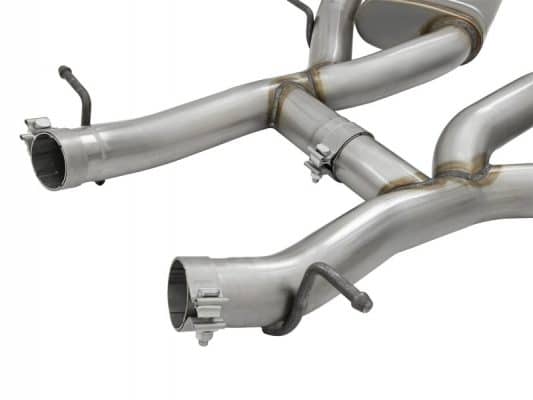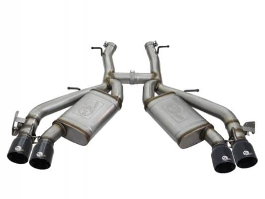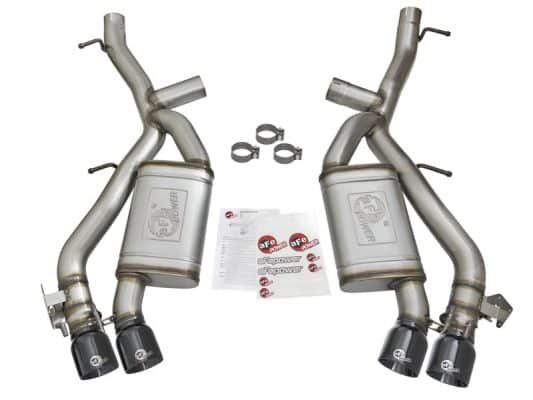 Testing: In testing, the axle-back exhaust system produced a max gain of +4 horsepower and +4 ft. lbs. of torque verified by our in house dyno. Potential for up to +24 horsepower and +27 lbs. x ft. of torque when combined with aFe’s Twisted Steel street Tri-Y headers/X-Pipe (P/N: 48-34127-YC). Aggressive Sound: Dual free-flowing mufflers are used to absorb high pitch tones producing a powerful sound and unleashing all available horsepower and torque. Exhaust Valve: This axle-back exhaust system incorporates factory style NPP dual mode exhaust valves which use the factory exhaust valve motors (not included). The valves help regulate, direct and control the flow of exhaust gases by opening, closing, or partially obstructing passageways depending on throttle position for maximum performance. 304 SS Construction: The performance axle-back exhaust system is constructed of 3″ mandrel-bent, 304 stainless steel tubing for maximum performance, corrosion resistance and strength eliminating cracking. Simple Installation: This MACH Force-Xp axle-back exhaust system uses factory mounting locations providing stability and a hassle-free installation. Quad Gloss Black Tips: Finishing off this system are quad gloss black, 4″ diameter tips. The tips come with a laser-etched aFe power logo for an aggressive style. Leak-Free Seal: High quality band clamps are used for a complete 360 degree sealing surface. Note: This system only fits manual transmissions models without AFM valves.
