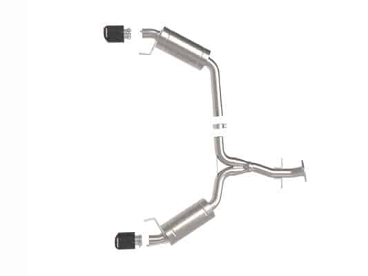 This axle-back exhaust system is constructed of 2-1/2 IN mandrel-bent 304 stainless steel tubing for maximum strength and durability. This system features dual high-flow stainless steel mufflers, producing an aggressive sound. Muffler finish may vary. Finishing off this exhaust system are dual 4-1/2 IN diameter carbon fiber 304 stainless steel clamp-on exhaust tips. The tips features an aFe POWER logo for a unique style. This system produces an aggressive sound unleashing all available horsepower and torque.Utilizing a factory style flange and hangers this system is a direct bolt-on system, which requires no cutting or modifications for a hassle-free installation. Utilizing state-of-the-art computer-aided design technology, this exhaust system is designed for custom, high tolerance factory fitment. 100% MIG-Welded for race-proven strength and durability.