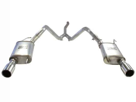 Introducing the new aFe Power MACH Force XP dual exhaust system for the 05-09 Ford Mustang V6-4.0L. In recent testing, this system produced 12 horsepower and 16 lbs. x ft. of torque. This exhaust is constructed from 2.5in. mandrel bent, stainless steel and is MIG-welded. Dual high flow, stainless steel, single in, single out mufflers are used to maximize performance across the power band while maintaining a great tone. To finish off this exhaust aFe uses dual, laser etched, 3.5in. polished 304 stainless steel tips. Note: The V8 rear bumper cover is recommended (Ford OE Part Number 5R3Z17K835BAA). The use of the OE V6 bumper cover requires cutting and should be performed by a skilled technician.