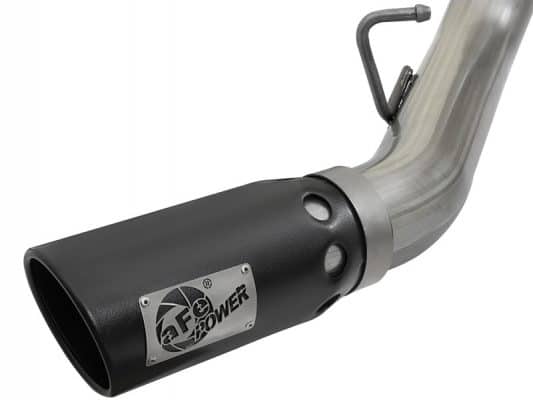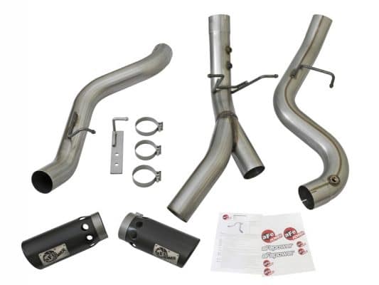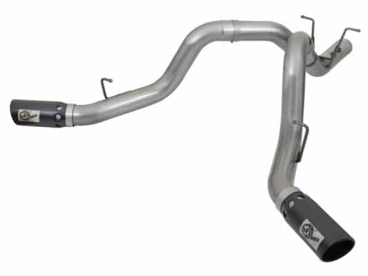 Interested in a new exhaust system for your L5P Duramax? Check out the Large Bore-HD dual DPF-Back exhaust system by aFe. This system is constructed from 4″ mandrel-bent 409 stainless steel tubing and uses high quality band clamps and OE-style bayonet hangers. This unit uses all factory mounting locations and comes with a bolt-on bracket that supports the driver side tailpipe. This provides for a quick, hassle-free installation with no modification necessary. Also included in this exhaust system are dual massive 6″ high temp black powder-coated stainless steel tips with a laser-cut stainless steel aFe power badges. Large Bore-HD exhaust systems are the perfect combination of performance, fit and value. Single To Dual Exhaust Conversion: This exhaust is designed to convert the standard single exhaust into an aggressive dual exhaust. Fits With Spare Tire: This exhaust system fits perfectly without relocating the spare tire. OE Fit: OE-style bayonet hangers are used to maintain a stable pipe location during high vibration and high heat conditions. The bayonet tip holds the hanger bushing in place for an OE-style fit that does not change with time. Flow and Performance: This Large Bore-HD exhaust system is constructed from 4″ mandrel-bent stainless steel tubing for maximum flow. Smooth transition bends allow for low turbulence, increasing horsepower, torque and lowering EGT’s. Massive 6″ Black Tips: Finishing off the exhaust are dual powder-coated high temp black 304 stainless steel exhaust tips. This tip features a laser-cut stainless steel aFe power badge for an aggressive style.
