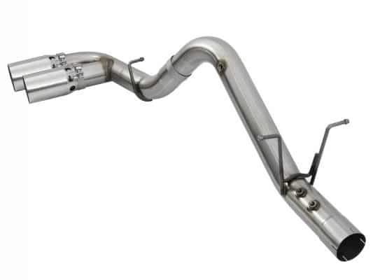 Simple Installation: All systems use factory mounting locations providing stability and hassle-free installation. Leak-Free Seal: High quality band clamps are included for a complete 360 degree sealing surface. OE Fit: OE-style bayonet hangers are used to maintain a stable pipe location during high vibration and high heat conditions. The bayonet tip holds the hanger bushing in place for an OE-style fit that does not change with time. Flow and Performance This exhaust system is constructed of 4″ mandrel-bent stainless steel tubing for maximum flow. Smooth transition bends allow for low turbulence, increasing horsepower, torque and lowering EGT’s. 5″ Diameter Polished Intercooled Tips: Finishing off the exhaust are 5″ diameter, polished, stainless steel straight cut tips with intercooling vents designed to reduce exhaust gas temperatures at the tailpipe. A unique stainless steel laser-cut aFe Power logo plate is riveted on for an aggressive style. **Cutting stock exhaust is required.