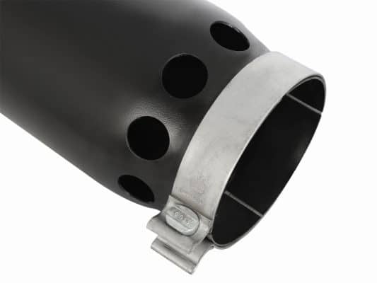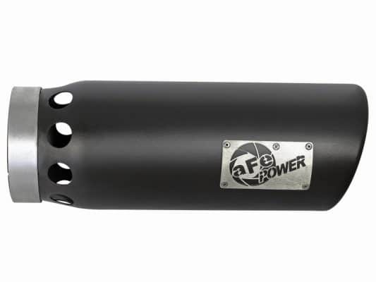 aFe Power is proud to introduce an all new intercooled exhaust tip. This tip comes with a black finish and is designed to fit 5 exhaust systems. With a 5 inlet x 6 outlet and 16 inch length, this single-walled, angle cut rolled tip comes with intercooling vents and a unique laser-cut aFe Power logo plate riveted on for an aggressive style.