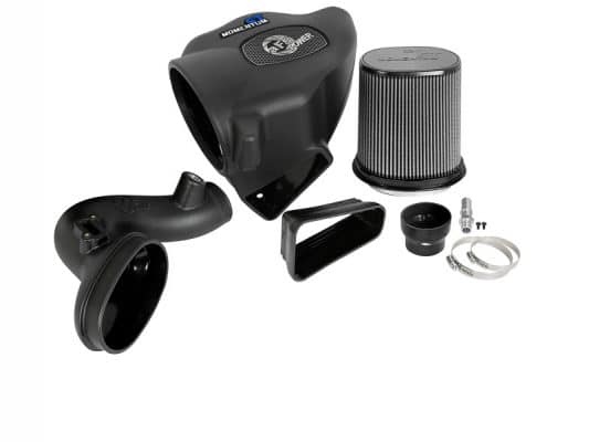The smooth one-piece sealed housing is used to eliminate the use of multiple-piece housings and ensure the coolest air intake charge available. This System uses a CAD designed, dyno-tuned, roto-mold intake tube to achieve maximum power gains while maintaining a perfect fit. The Momentum ST intake is designed around an oil-free, large 9″ Tall conical flat top 360 degree radial flow performance air filter with 3-layers of progressive finer porosity synthetic media providing maximum convenience. The unique air filter-to-housing interface (patent pending) allows for maximum filter size which increases the available air volume while simplifying the installation process. Premium stainless steel worm gear clamps and a silicone coupler are used for strength and durability while also providing the most secure installation available. Momentum ST intakes are designed with fewer parts for a quick and simple installation.