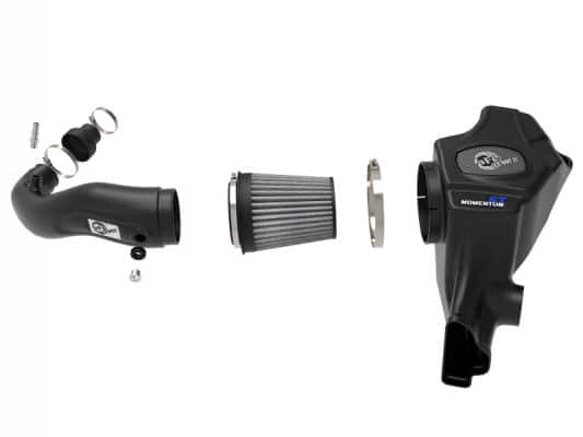 The smooth one-piece sealed housing is used to eliminate the use of multiple-piece housings and ensure the coolest air intake charge available. This System uses a CAD designed, dyno-tuned, roto-mold intake tube to achieve maximum power gains while maintaining a perfect fit. The Momentum ST intake is designed around an oil-free, large 9″ Tall conical flat top 360 degree radial flow performance air filter with 3-layers of progressive finer porosity synthetic media providing maximum convenience. The unique air filter-to-housing interface (patent pending) allows for maximum filter size which increases the available air volume while simplifying the installation process. Premium stainless steel worm gear clamps and a silicone coupler are used for strength and durability while also providing the most secure installation available. Momentum ST intakes are designed with fewer parts for a quick and simple installation.