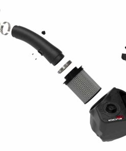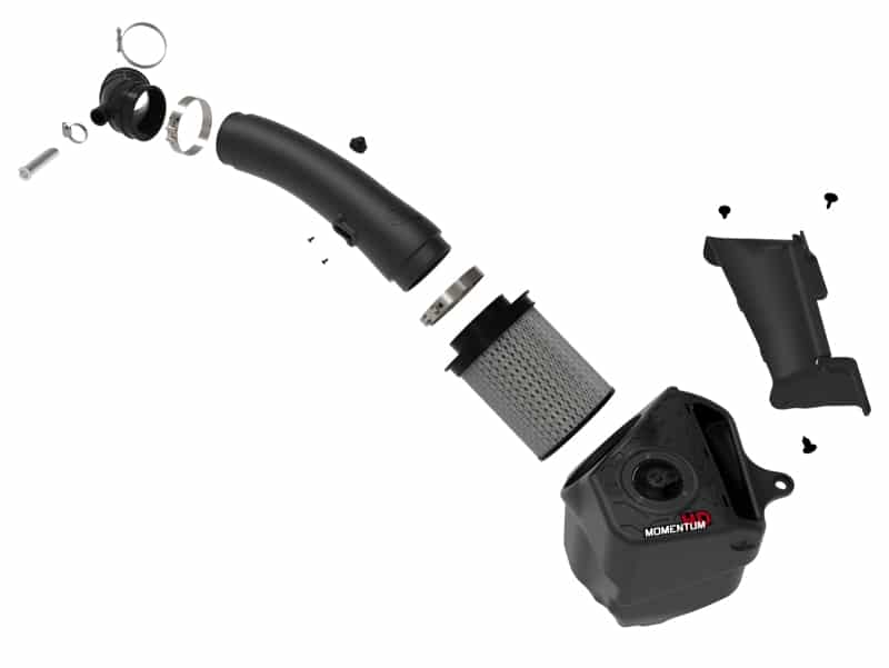 Momentum’s unique filter-to-housing interface was built to feature the largest air filter possible. This 8” tall, pre-oiled 360-degree radial flow air filter has a 4” round flange and features our non-oiled Pro DRY S media. The Pro DRY S performance air filter features 3-layers of progressively finer porosity synthetic media that does not require oil providing maximum convenience. Its inverted top and large surface area provide much longer life between maintenance intervals, while reinforced metal provides maximum strength to prevent filter collapse. The smooth one-piece sealed housing, constructed of heat-resistant cross-linked polyethylene (XLPE), features our patented pending filter-to-housing interface. Its innovative design minimizes the total number of parts, making for an easy installation. A large, clear sight window allows for hassle-free filter inspection, without having to disassemble your system. The soft EPDM hood seal is included to keep out hot engine air and create a perfect seal to the hood. This system features a high quality, computer-designed, dyno-tuned intake tube to achieve maximum power gains while maintaining a perfect fit. Its XLPE material is heat soak resistant and extremely durable. Momentum HD intakes are designed with fewer parts for a fast and easy installation. This is a direct fit intake system that utilizes factory mounting points and requires no cutting or modifications. All necessary T-bolt clamps, couplings, and hardware are included