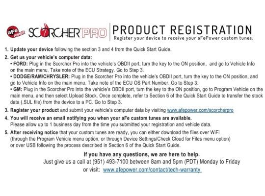 Customer will receive a selection of 6 tunes depending on vehicle information and its requirements: High Octane Performance Tune, High Octane Tow Tune, High Octane Fuel Economy Tune, Low Octane Performance Tune, Low Octane Tow Tune, Low Octane Fuel Economy Tune. The customer will also have the ability to adjust Tire Size, Axle Ratio, and TPMS. (the device stores your vehicles factory tune file for easy restoration back to the factory settings). Connects to the vehicle’s OBDII port and has Wi-Fi capability so you can download aFe POWER’s custom tunes whenever or wherever you want. Can also be connected to a PC to download aFe POWER custom tunes. Monitor and display critical vehicle data using on-screen, full color customizable gauges. View, capture or download your vehicle’s data on one device. The SCORCHER PRO Performance Programmer offers the capability to reads and clear DTC’s (diagnostic trouble codes).
