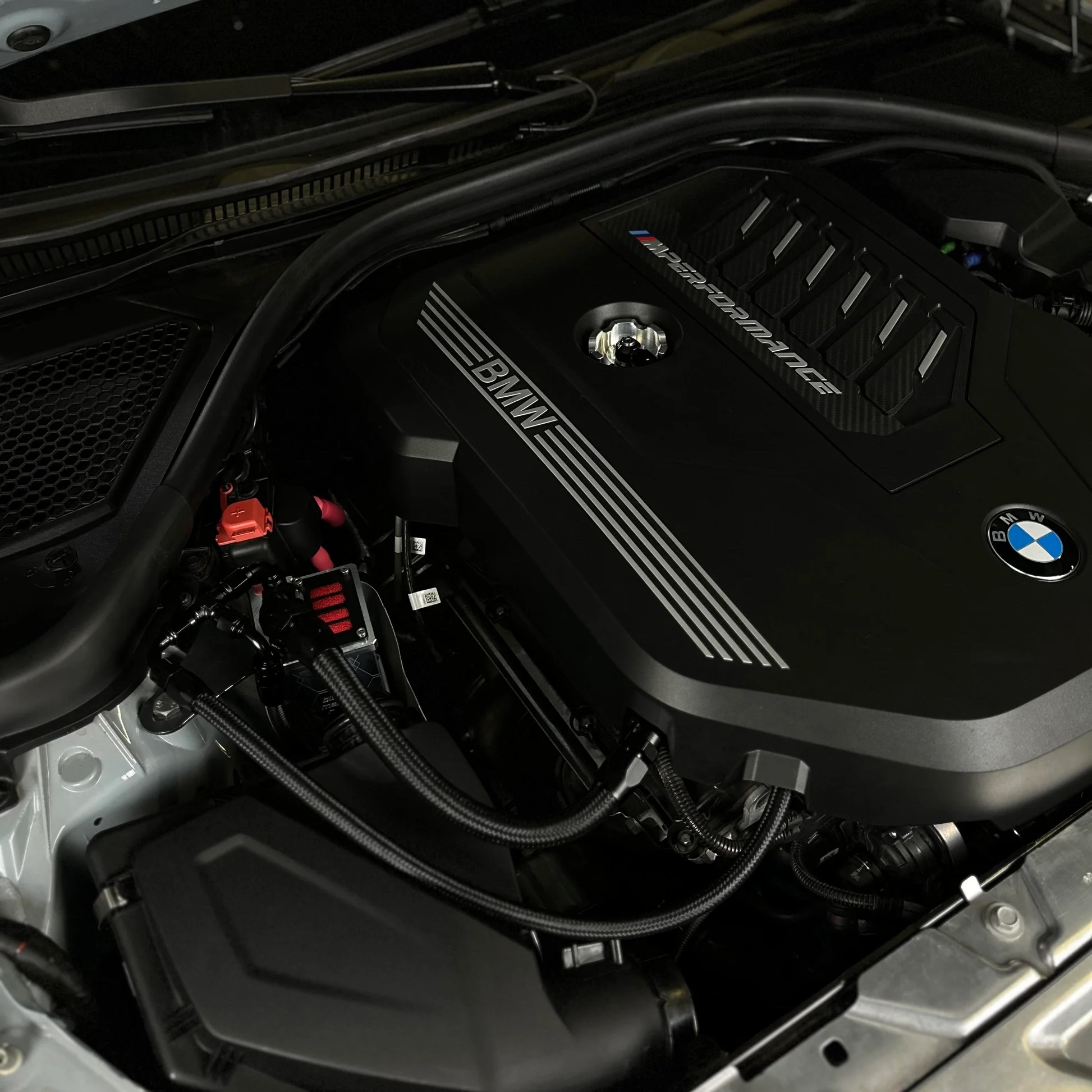Any B58 that is tuned will eventually suffer from excessive crank case pressure. Most people choose to vent the oil cap with a filter to remedy this, which can leave a big mess and looks pretty awful. Our B58 Catch can routes a braided AN hose from our custom billet oil cap to the catch can all while staying UNDER the engine cover!