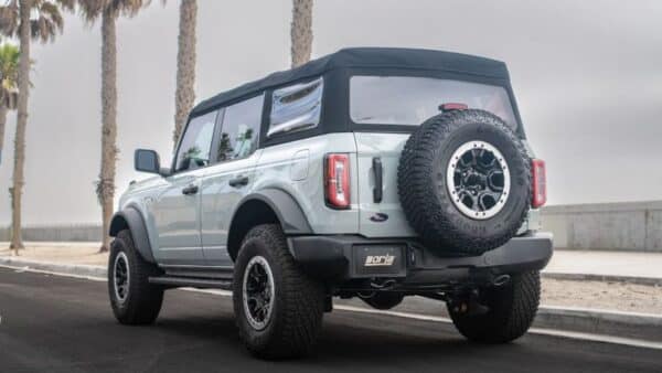 The BORLA(r) team has created a system especially for the 2.7L Ford Bronco. This Cat-Back(tm) exhaust system is engineered for performance and has our mild “Touring” sound no drone. This exhaust system features a 2.5″ inlet that flows into a 2.75″ pipe and exits via dual 2.5″ diameter tailpipes with 4″ polished T-304 stainless steel exhaust tips. Our custom muffler hanger design moves the hanger out of sight for a clean appearance. T-304 stainless steel construction provides additional durability over the stock exhaust. Ultra-smooth mandrel bends ensure maximum flow & power, and precision computer numerical control (CNC) manufacturing ensures an accurate fit. Give your Bronco a boost in performance and sound, bolt on a BORLA(r). All BORLA(r) Cat-Back(tm) and Axle-Back systems are made in the USA and are covered by our Million-Mile warranty. , System Features: , Cat-Back(tm) Exhaust System, Touring Sound Level, 2.5″ Inlet Flows Into 2.75″ Muffler Inlet & Dual 2.5″ Tailpipes, No-Drone, 4″ Polished T-304 Stainless Steel Tips, Million Mile Warranty