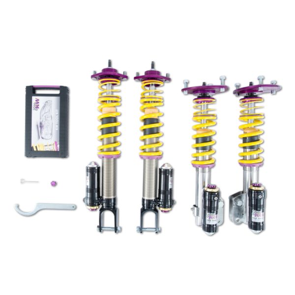 Using the Nordschleife as it’s testing grounds and the 7-post rig, KW developed it’s 3-way Clubsport coilover kit. Wheel loads, vehicle weight and chassis reinforcements (increased body stiffness) can all be taken into consideration with Adjustment -apabilities of the 3-way Clubsport. The KW Clubsport coilovers combine KW’s high-end racing technology -ith maintenance-free KW OEM quality components. Designed to provide you the ideal product to utilize the full potential of your sports car during autocross, track days, high performance drivers education (HPDE) courses, club racing, and is tested rigorously on race tracks such as the Nurburgring Nordschleife. Race teams rely on KW’s racing expertise and experience for their vehicle setup. This same championship winning pedigree is mirrored in the development of each one of the KW Clubsport coilover systems. Similar to the KW Competition suspension used in international motorsports, the KW 3-Way Clubsport coilover kit allows fine tuning of the compression damping separately in the low-speed and high-speed range. The click adjustments of the TVCLH-A valve technology -ake for easy Adjustment -irectly on the reservoir. You can modify the low-speed compression damping with 6 precise clicks with the purple low speed Adjustment -ial and directly beneath it the golden Adjustment -heel provides an additional 14 precise clicks of high speed compression adjustment. In addition, the TVR-A technology -rovides 16 clicks to noticeably adjust the rebound damping independently of the compression damping. If you would like to adjust the KW 3-Way Clubsport coilover kit it can easily be adjusted for more comfort or to an alternative setup for a new race track. The KW 3-Way Clubsport benefits from the same motorsports technology -hat has proven its endurance with multiple overall wins at the ADAC Zurich 24h Nurburgring race.