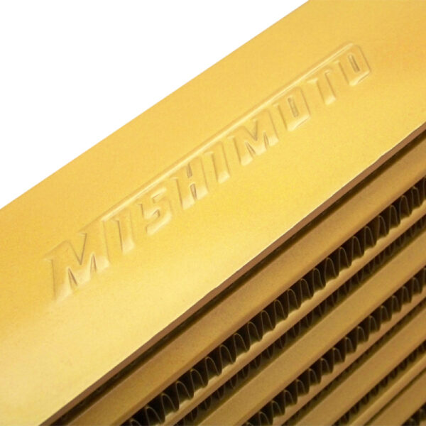 This Mishimoto limited-edition Eat Race Sleep version of the M-Line aluminum intercooler features a gold core with gold end tanks.This universal front-mount intercooler will give the perfect cooling capacity needed for smaller turbo applications.All Mishimoto intercoolers are constructed of 6061 aluminum and are TIG welded to perfection.Limited Edition, while supplies last! Note: For your taste, only one side of the intercooler has the Mishimoto logo.